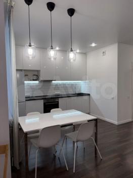 Санузел в кафеле, освещение, розетки, всё как положено, стиральная машинка. Кухня - все шкафы и ящики с доводчиками, освещение рабочей зоны, холодильник 2 метра, микроволновка, чайник, варочная поверхность, духовка новые. Обеденная зона: большой стол и 4 стула. В комнате разборный диван, тумба под ТВ, телевизор по запросу. Большой шкаф-купе до потолка.