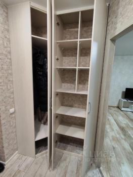 Барный стол с 2 стульями, который разделяет зону отдыха и зона готовки. Встроенный вместительный шкаф в коридоре из трёх секции.