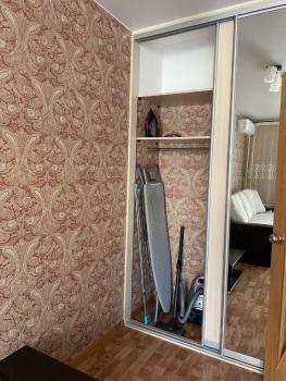 В комнате диван, стенка+телевизор, кондиционер, гладильная доска, утюг, сушилка, пылесос, журнальный столик, очень много шкафов для хранения.