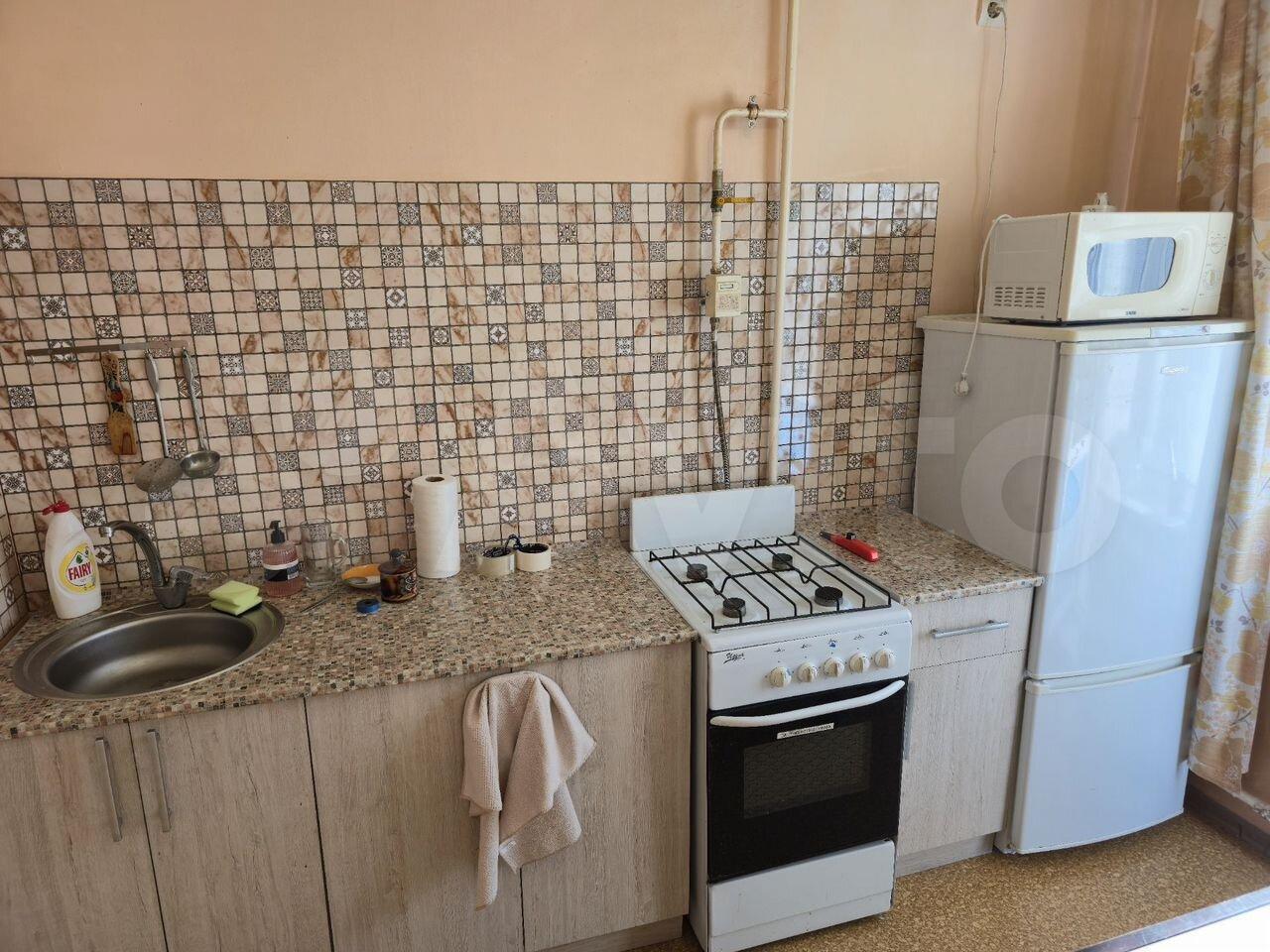 Кухня оборудована всем необходимым: есть холодильник, электрическая плита, микроволновка, чайник, а также выход на лоджию. Санузел совмещённый, установлена стиральная машина. В прихожей — домофон. В комнате есть шкаф-купе, кровать и сушилка для белья.