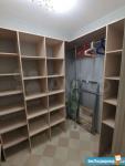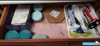 В гардеробной есть сушилка для вещей, гладильная доска, утюг, удобная швабра для мытья полов, несколько контейнеров для вещей, таз, два складных табурета.