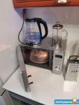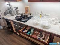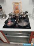 Кухня - красивая, удобная и светлая столешница с большой зоной для приготовления пищи, каменная мойка, гибкий смеситель, индукционная варочная поверхность, современный духовой шкаф, посудомоечная машина, микроволновка, чайник холодильник, вытяжка, кухня укомплектована новыми комплектами посуды для всей семьи, кастрюлями и сковородой taller.