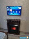 Комната - огромная двуспальная кровать 180х200 с ортопедическим матрасом и новыми подушками для сна и дополнительно декоративными, две удобные тумбы в уровень с кроватью, что позволяет использовать их как журнальный стол, так и кофейный, компьютерный стол, туалетный стол для макияжа с большим зеркалом фирмы лазурит, смарт телевизор LG, кабельное телевидение, камин с функцией подсветки и обогрева, один комплект постельного белья, интернет.