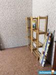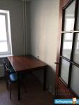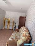 В комнате есть 2 кресла, диван (раскладывается), журнальный столик, 2 стилажа из ikea, гладильная доска. На окнах роль-шторы (день/ночь).