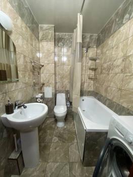 Ремонт, вся мебель и техника в хорошем состоянии. В квартире натяжные потолки, ламинат и плитка, большой застекленный балкон, есть мебель в прихожей. В комнате имеется диван, большой вместительный комод, телевизор, шторы. В кухне – большой холодильник в отличном состоянии, кухонный гарнитур, электроплита, кухонный стол и стулья. Санузел совмещенный в отличном состоянии, современный кафель и санфаянс, установлена стиральная машинка.