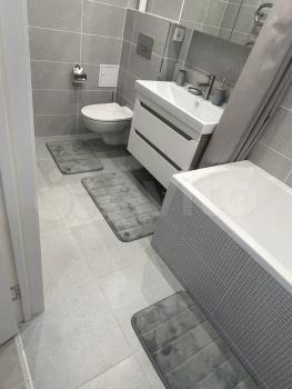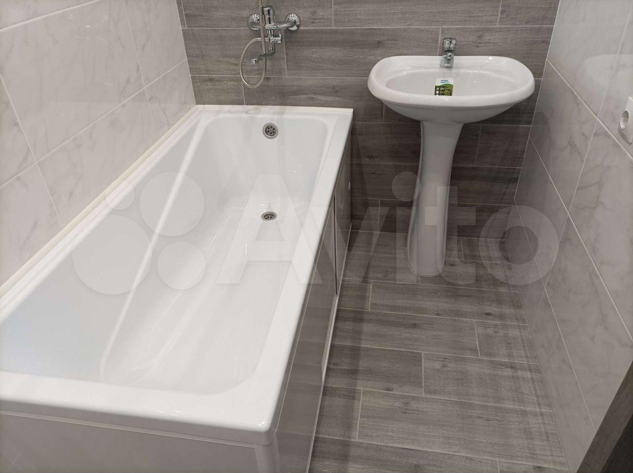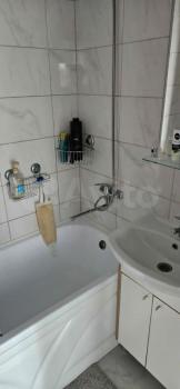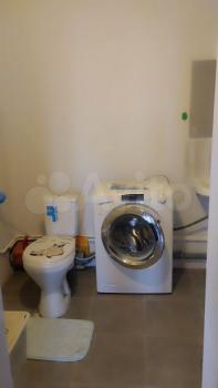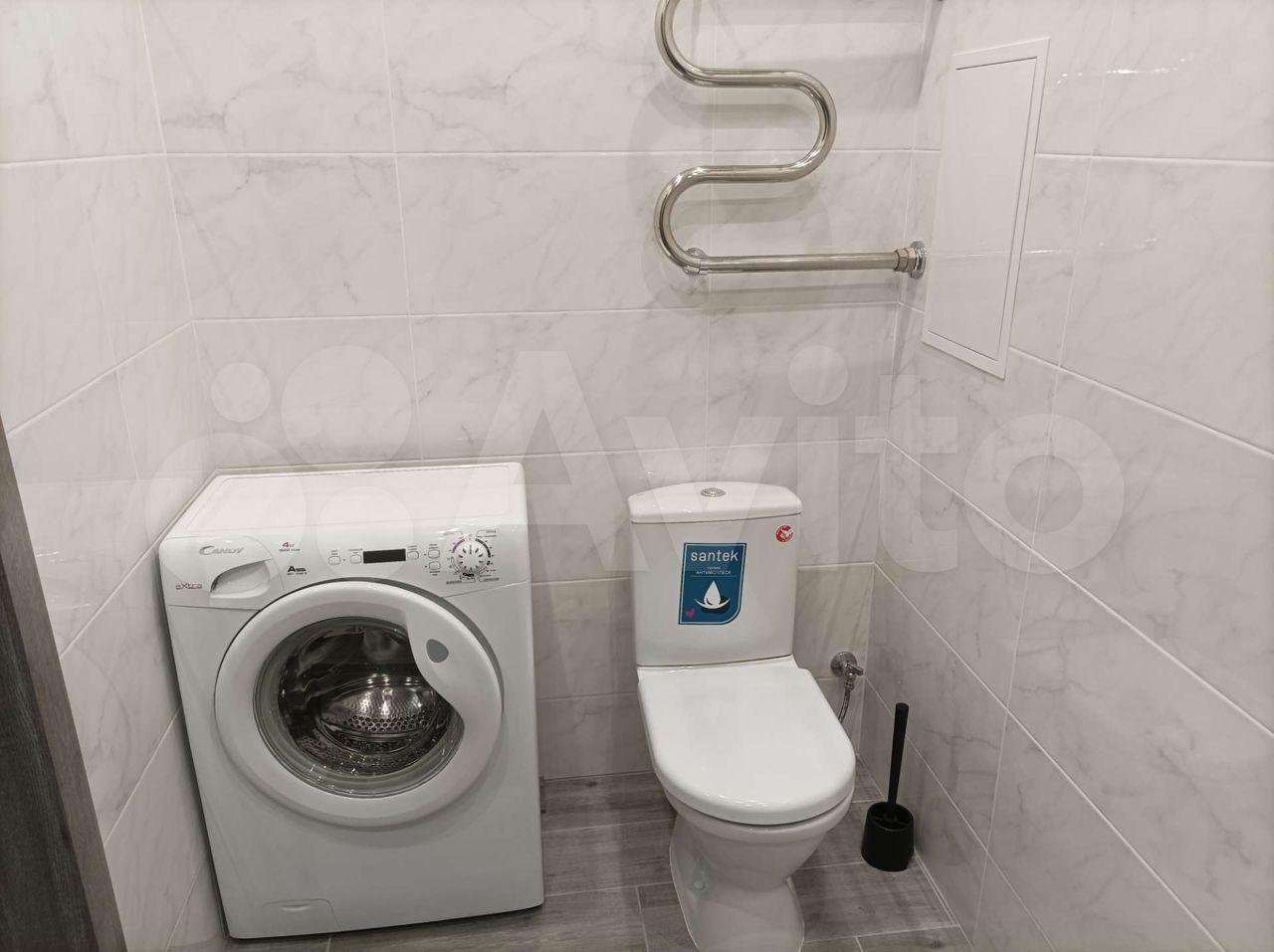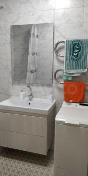 В ванной полноразмерные раковина, машинка, ванна и полотенцесушитель. Вся сантехника добротная, ничего не болтается и не капает.