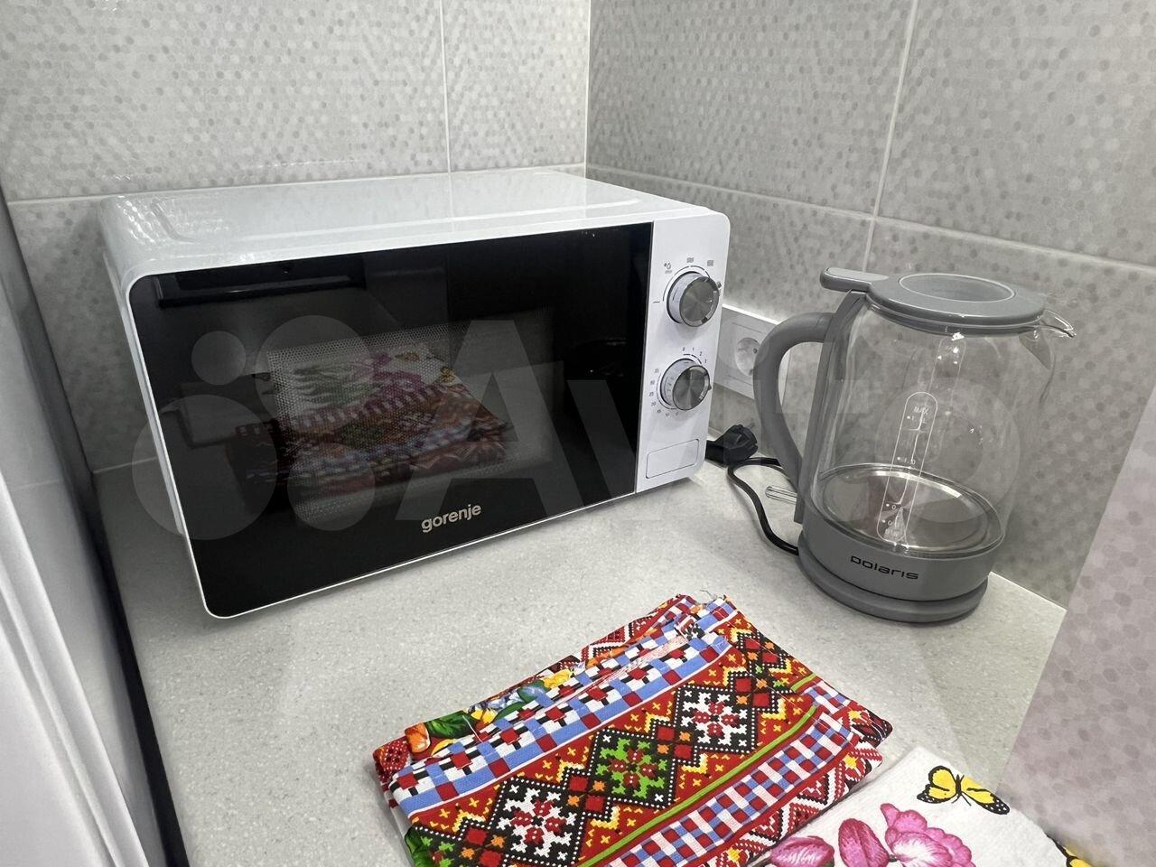 холодильник, плита, микроволновка, стиральная машина, телевизор.