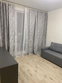 В квартире выполнен косметический ремонт. Просторная комната оборудована шкафами и диваном. Кухня оснащена холодильником и плитой. В ванной комнате установлена стиральная машина и совмещенный санузел.