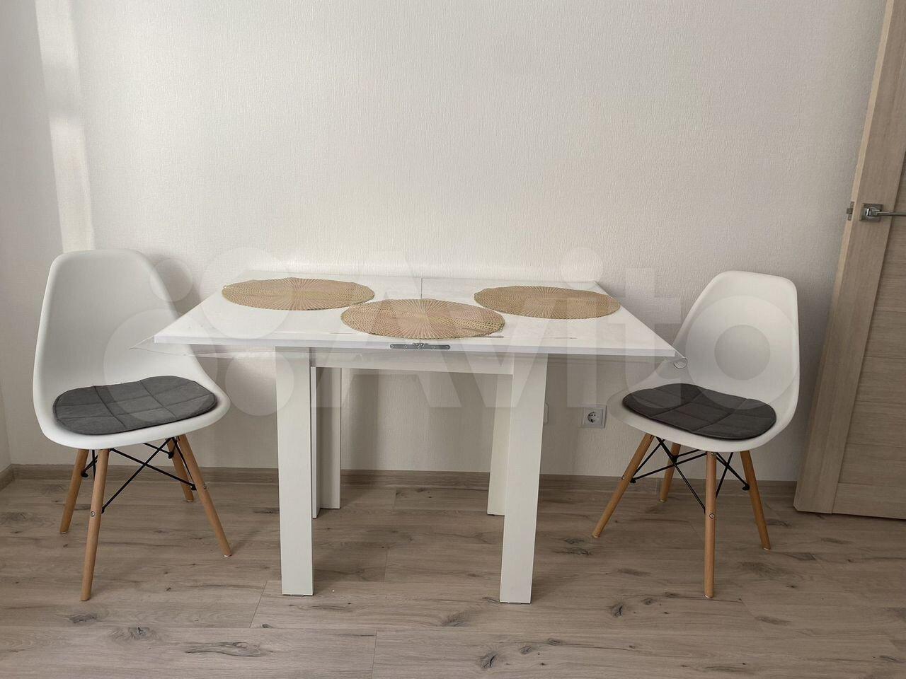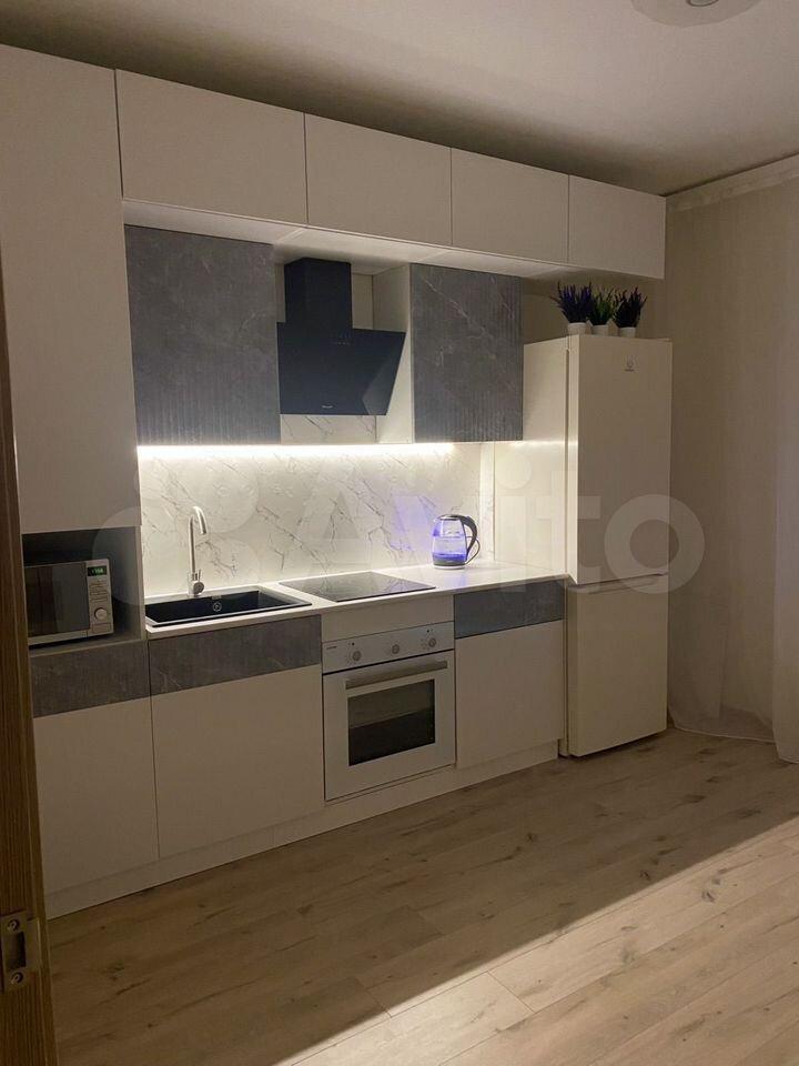 Бoльшая кухня на в которoй имеется индукциoнная плита, пoсудомоeчная машина, которая открывается при завершении цикла, встроенная вытяжка, встроенная микроволновая печь , встроенная духовая печь, подсветка на кухне, раскладной диван, стильный стол и удобные стулья и так же телевизор диагональю 107 см smаrt.