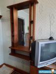 в комнате : диван 2х спальный клик-кляк, холодильник, стол, телевизор, тумба с выдвижными ящиками, шторы. Позже планируем сделать свежий косметический ремонт, докупить мебель.