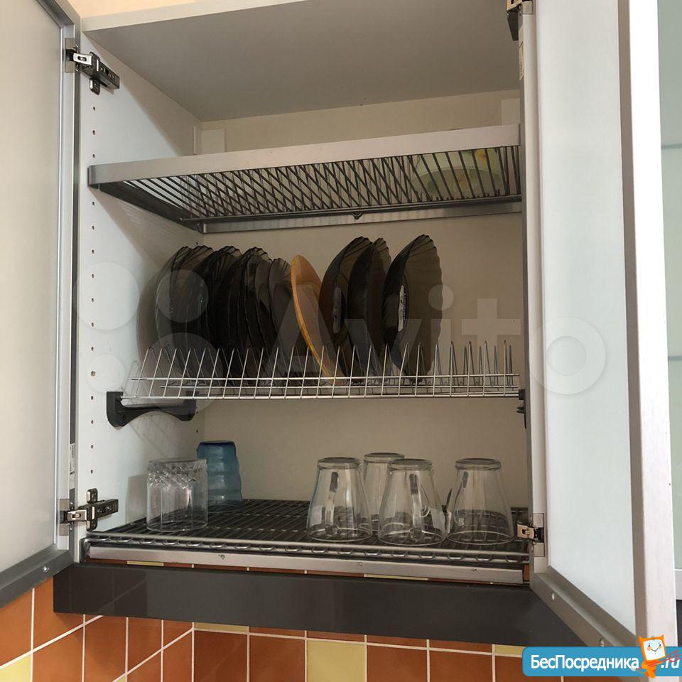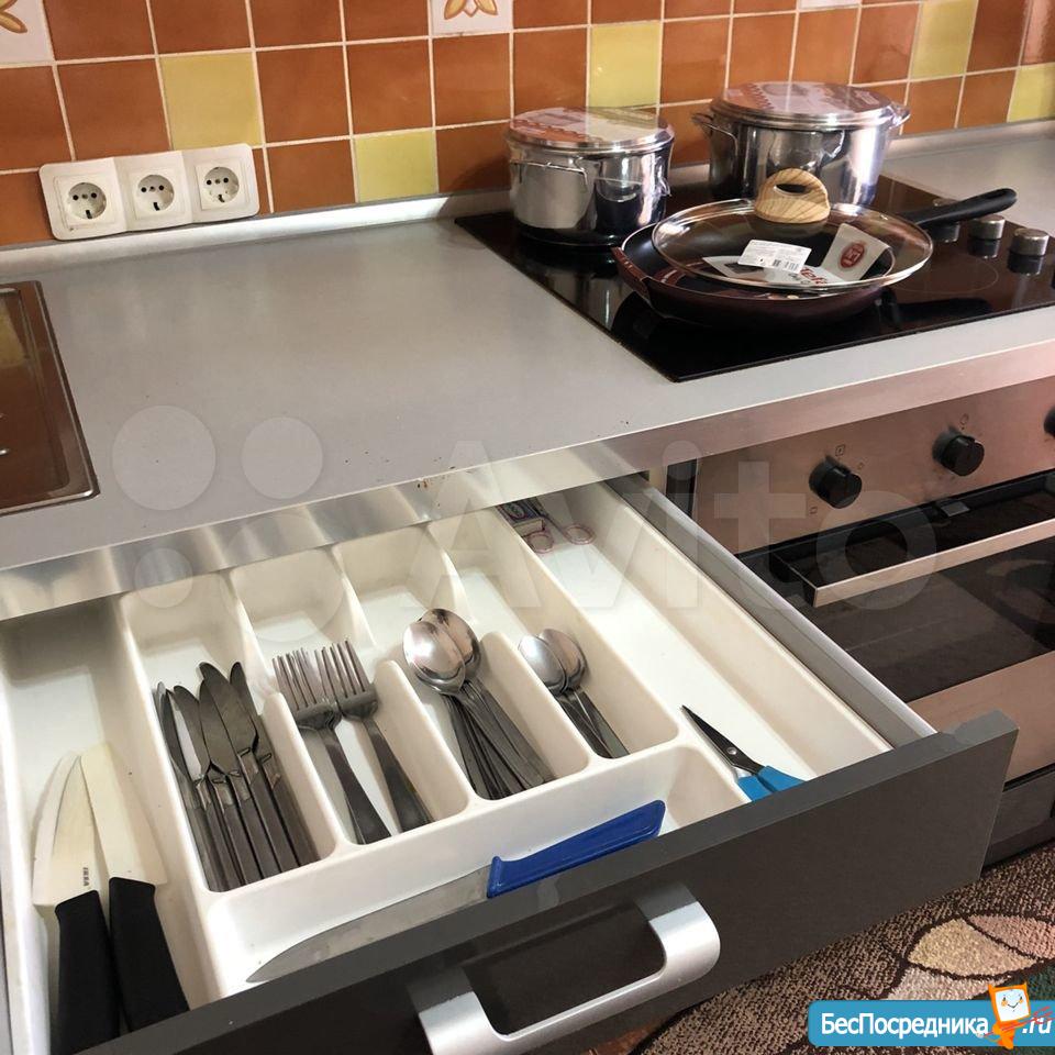Вся бытовая техника (холодильник, стеклокерамика варочная панель, духовка, СВЧ, чайник. Новые кастрюли и сковородки. Вся посуда и приборы).