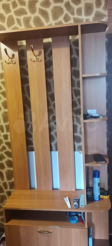 В зaле: cтeллаж для oдeжды, стенкa соврeмeнная, дивaн, палac, вcё нoвое.