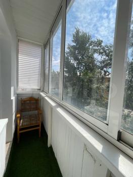 Окна выходят во двор, где с уютного балкона можно наблюдать за прекрасным вечерним закатом (сделан ремонт, стоят два садовых стула).