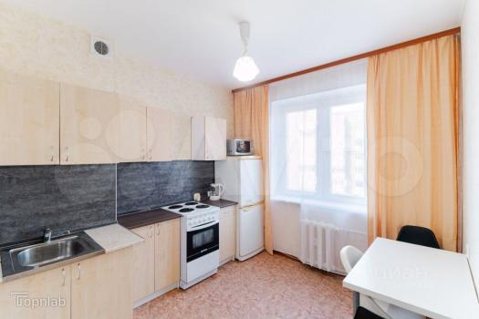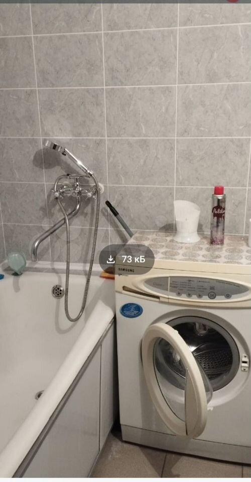 Кухня компактная, оснащена необходимой бытовой техникой: холодильником, микроволновой печью и стиральной машиной. Санузел совмещенный, оформлен в светлых тонах. Из окон открывается вид на тихий двор с открытой парковкой.