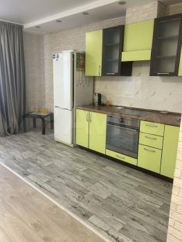 В квартире выполнен косметический ремонт. Просторная жилая зона оборудована шкафами и диваном. Кухня светлая, оснащена холодильником, плитой и микроволновкой. Санузел раздельный, оформлен плиткой.