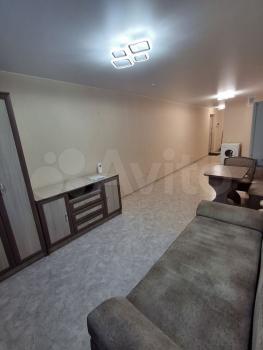 В квартире выполнен косметический ремонт. Просторная комната оборудована шкафами и диваном. Из мебели также имеется вместительный шкаф-купе. Кухня оснащена необходимой техникой, включая плиту и стиральную машину.